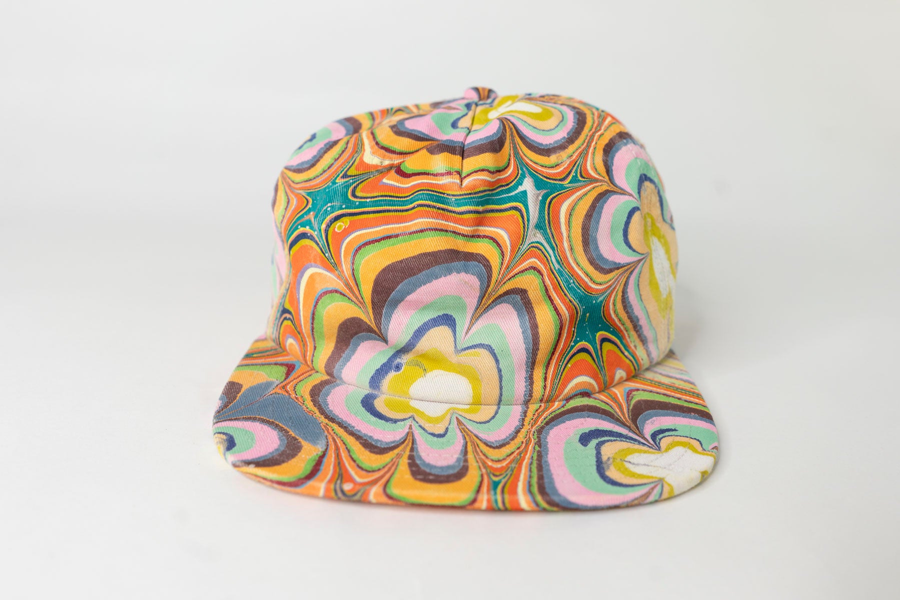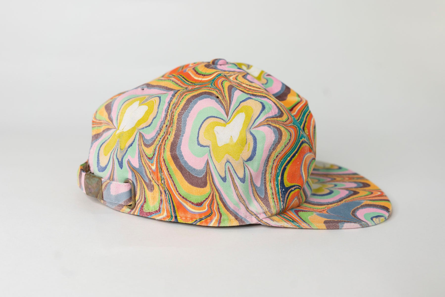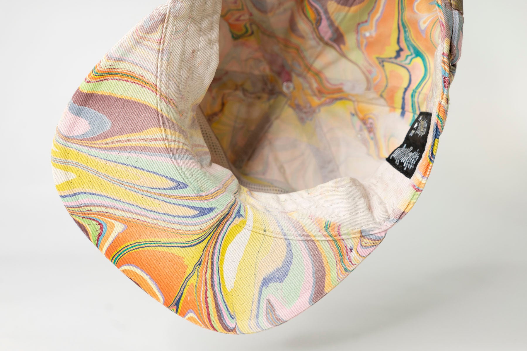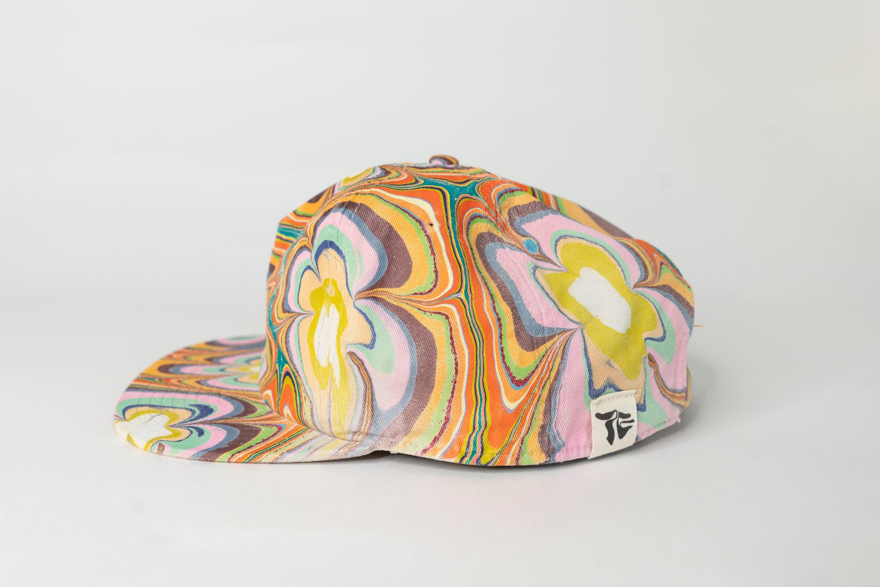 Each Tempered East marbled hat is one-of-a-kind artwork for your head! The hat has a mid-profile, 5-panel design with a flat brim crafted from lightweight 100% cotton and includes an adjustable fastener with a metal clasp. The flat brim hat has been dipped into a marbled pattern designed and created by hand using acrylic-based paints and treated for long-lasting color.