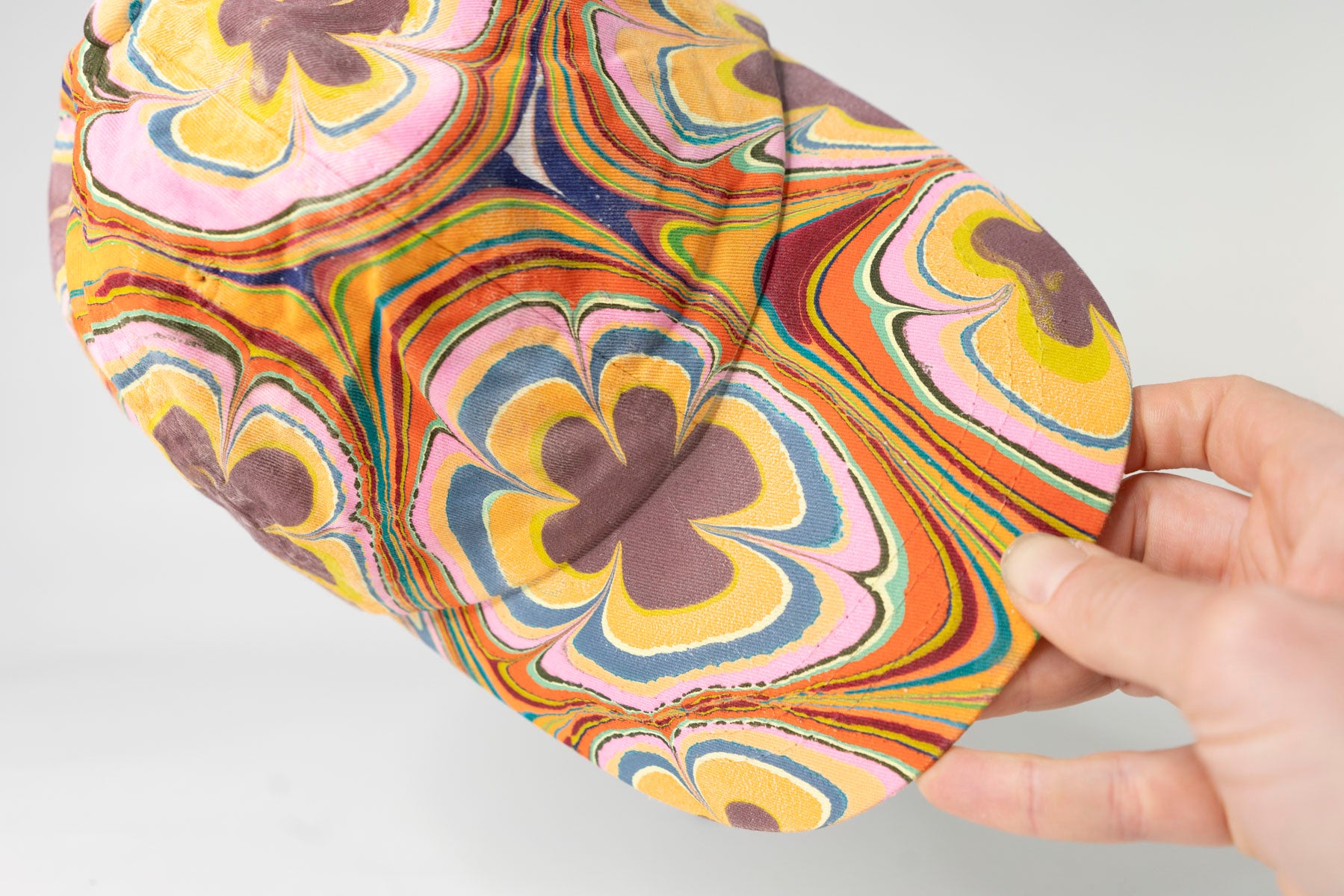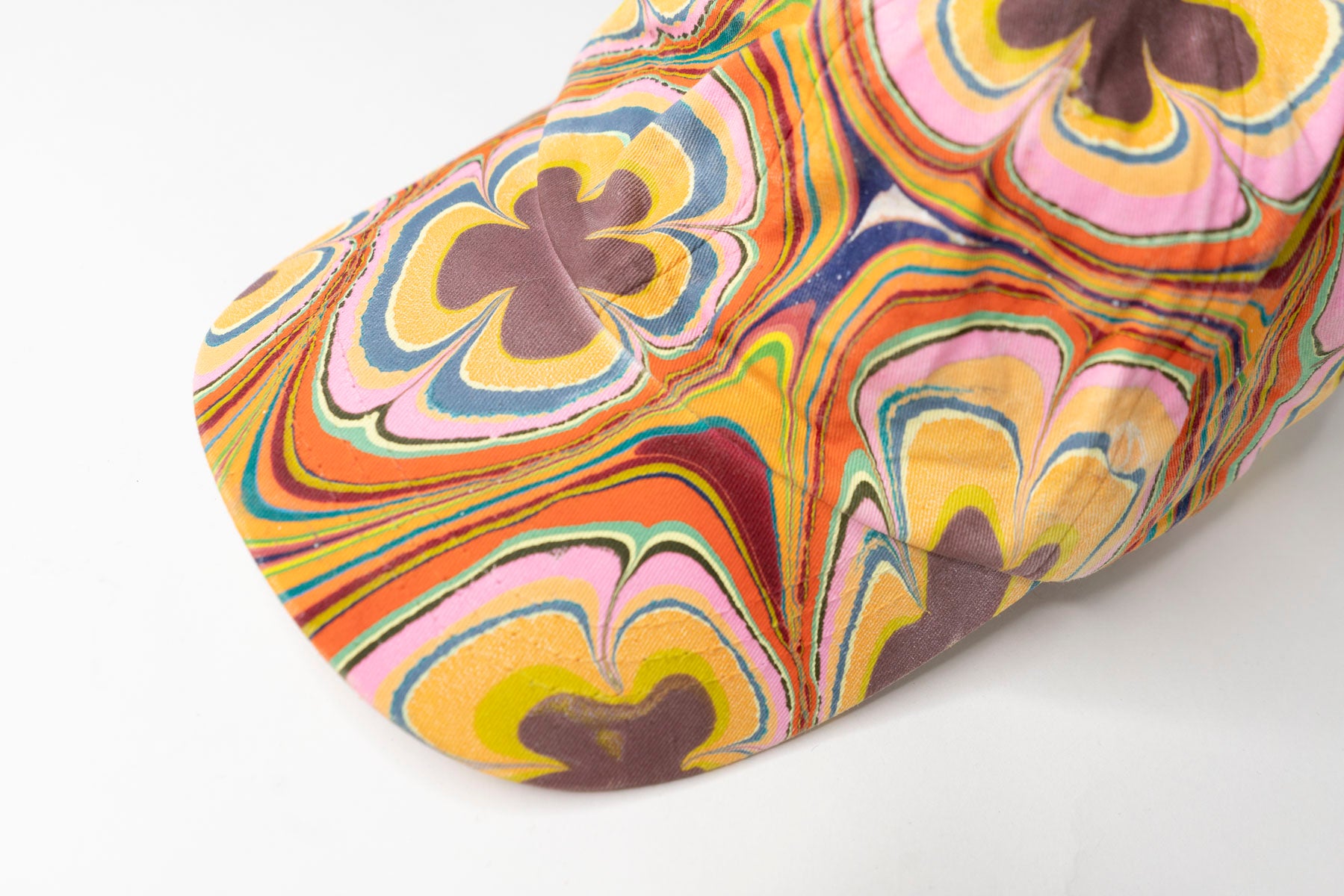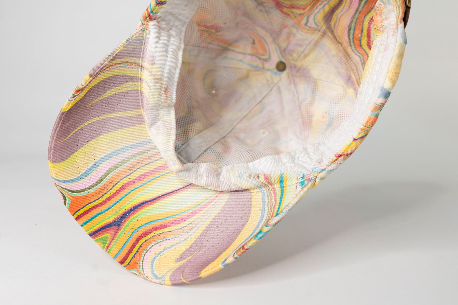 Each Tempered East marbled hat is designed and hand-dipped, making it a one-of-one party hat. The hat has a low-profile, six-panel design with a curved peak crafted from 100% cotton, lined with a nylon netting, and includes an adjustable leather fastener with a metal clasp. The classic dad hat has been dipped into a marbled pattern designed and created by hand using acrylic-based paints and treated for long-lasting color.