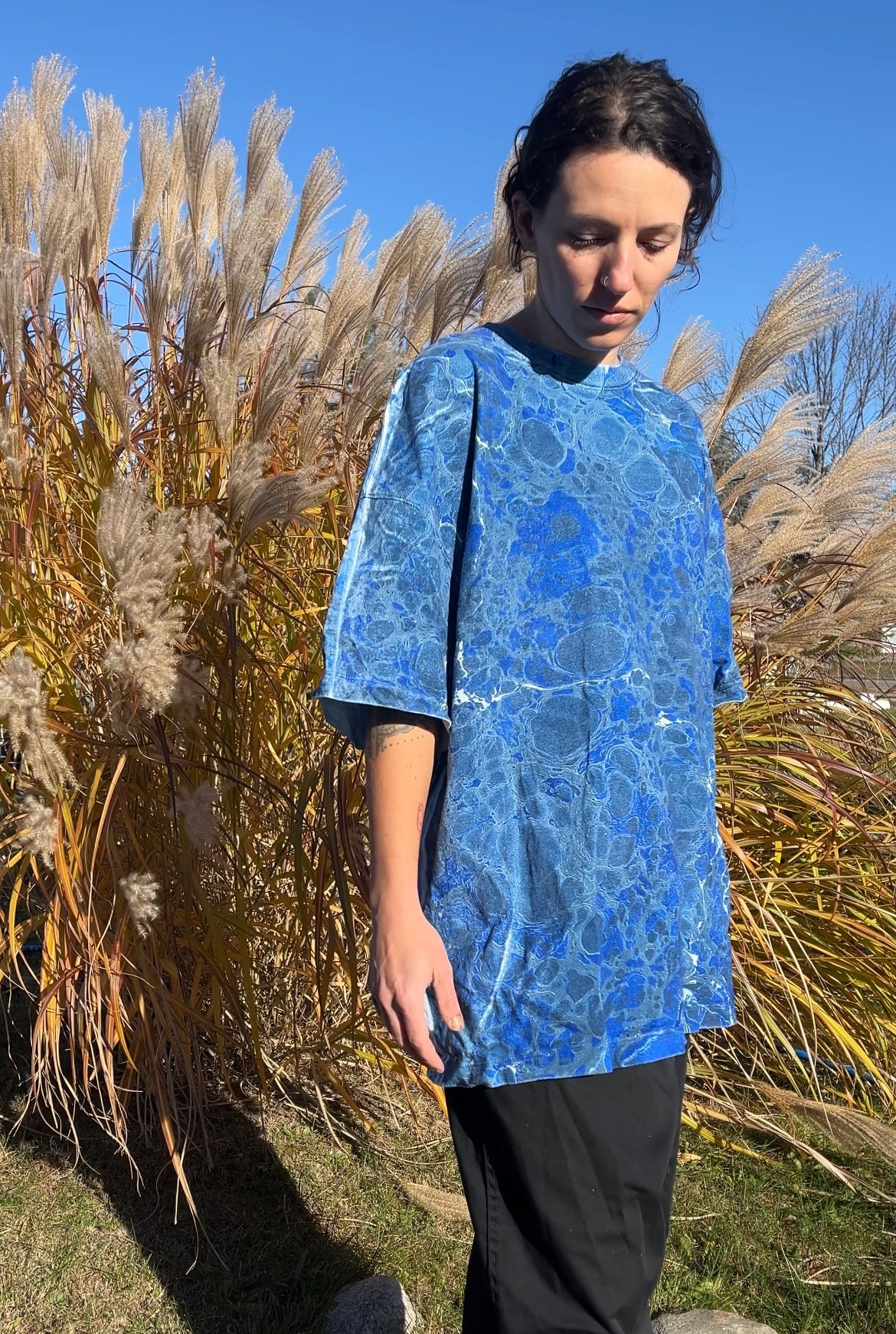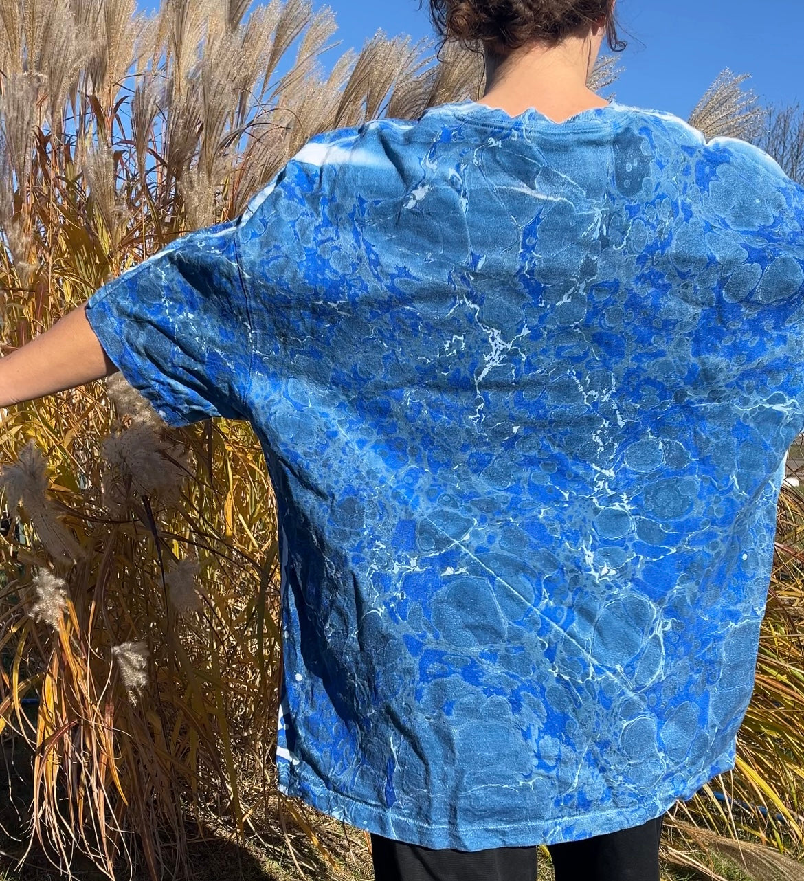 The shirts used for this collection included a variety of brands and sizes. They are all 100% cotton. Some of the shirts were bought secondhand, the marbled design giving the shirt a new, exciting life! All shirts fit differently, regardless of the size on the tag, so for reference, Claire models each shirt - she is 5'4" and typically wears a size x-small or small.